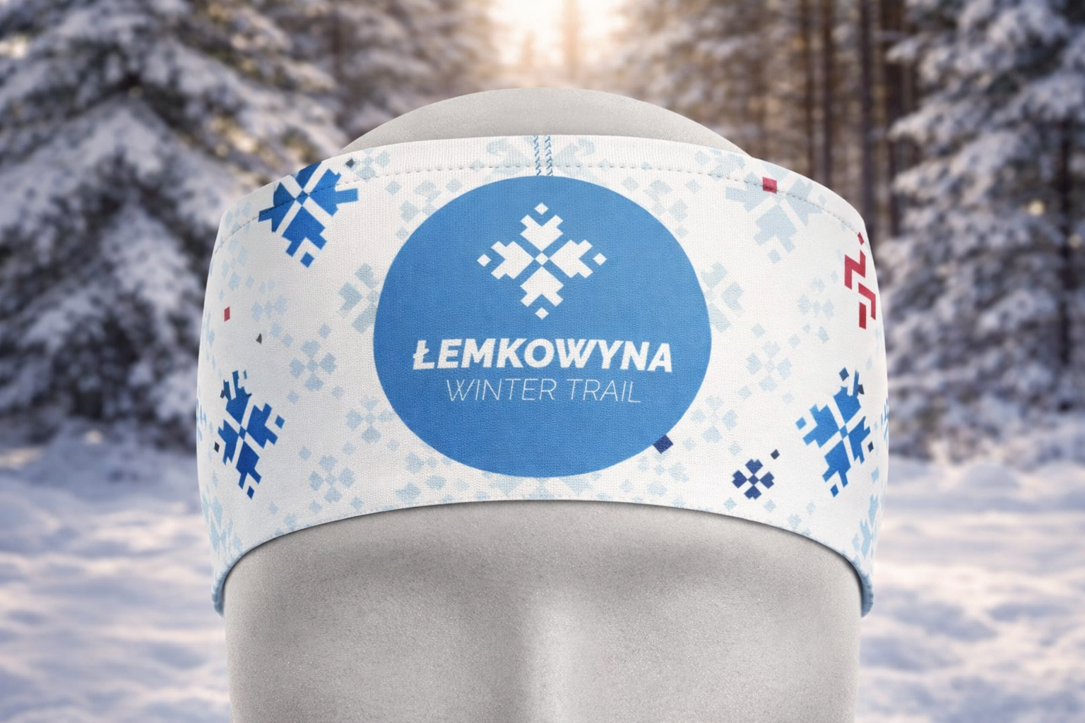 Model utrzymany jest w jasnej kolorystyce z charakterystycznym wzorem inspirowanym logo Łemkowyna Trail. Na froncie znajduje się wyraźne logo Łemkowyna Winter Trail, które podkreśla sportowy charakter opaski.